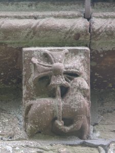The complete Romanesque church of St Mary and St David in Kilpeck, Herefordshire, has 93 surviving exterior corbels. Of these 24 surround the apse, 18 are on the chancel walls and 49 are on the nave walls. The final two corbels are reused as label stops for a chancel window. 12 of the corbels are either lost or too badly damaged to be interpreted. The first point to note is that only two of the corbels show recognisable religious subjects. Both depict the Agnus Dei, and they are placed in key positions: on the axis of the apse, and above the S nave doorway, which was the parish entrance.